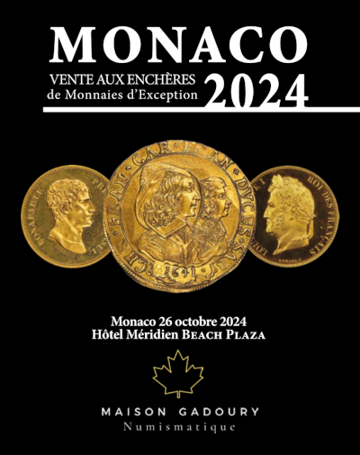 You can order the catalogue at Maison Gadoury Numismatique, 57, rue Grimaldi, 98000 Monaco; phone: +377 93 25 12 96; fax: +377 93 50 13 39; email: [email protected]. You can find the catalogue online at auction.gadoury.com. It is also possible to bid live on your computer at home via www.biddr.ch!