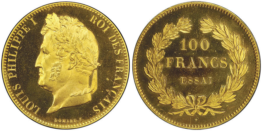 Lot 1032: France. Louis Philippe I, 1830-1848. Pattern of 100 francs in gold by Domard, no year (1831). PCGS PROOF 64. TOP POP. Estimate: 100,000 euros.