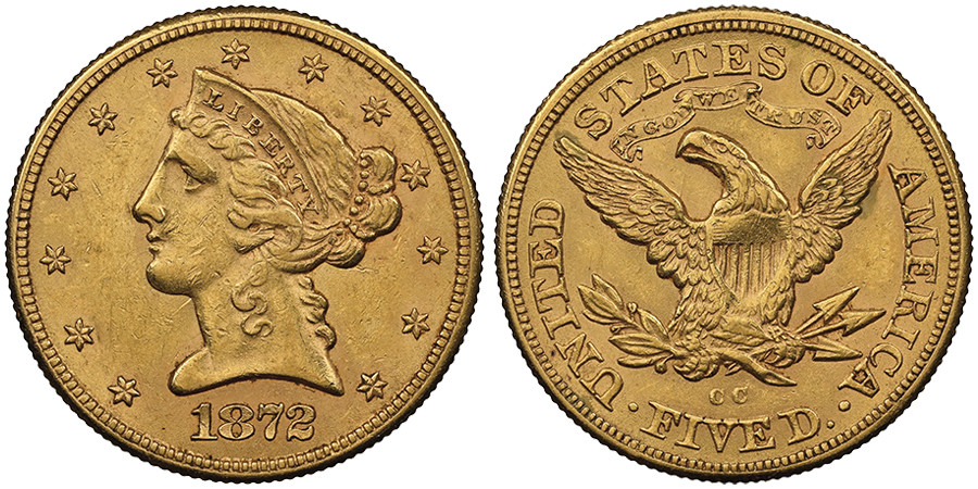 Lot 1585: USA. 5 dollars Half Eagle, Carson City 1872 CC. Only 16,980 specimens minted but less than 100 known. NGC AU 58. EXCEPTIONAL QUALITY! Starting Bid: 10,000 euros.