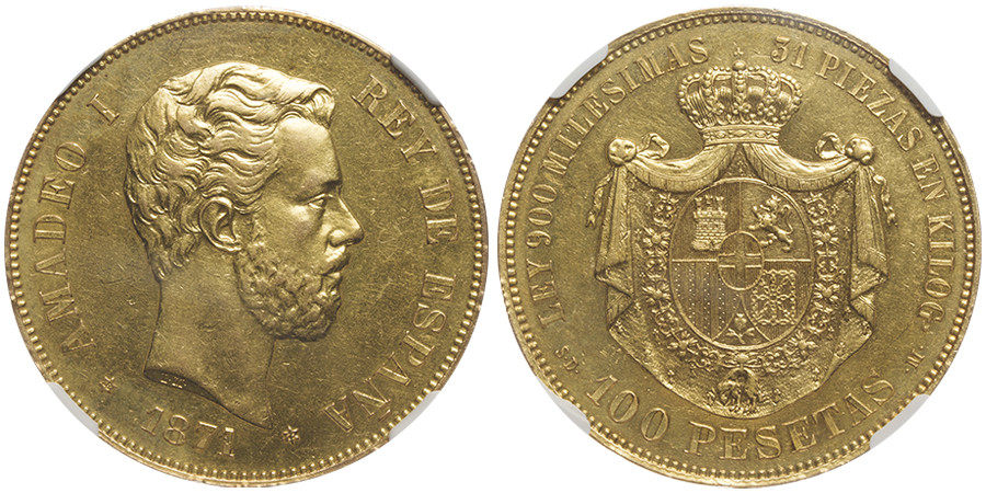 Lot 911: Spain. Amedeo I, 1871-1873. 100 pesetas, Madrid 1871. From Nomisma auction 47, No. 559. Only 25 specimens minted. NGC AU details, rim filling. Estimate: 50,000 euros.