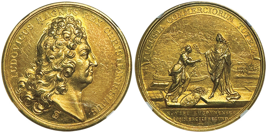 Lot 951: France. Louis XIV, 1643-1715. Undated gold medal of the chamber of commerce of Lyon. Extremely rare. NGC MS61. Estimate: 30,000 euros.